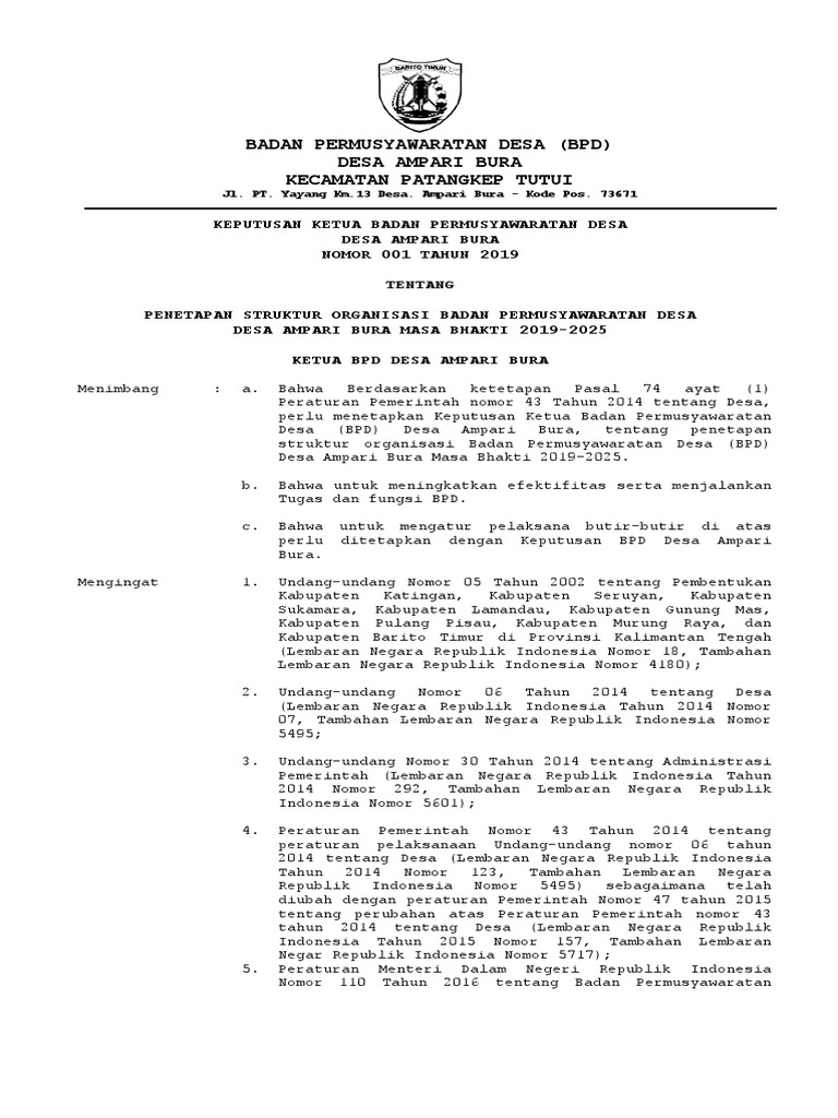 Contoh surat keputusan kepala desa tentang pembentukan panitia bpd. 1 down votes mark as not useful. Mulai tahun 2020 ini bpd mendapatkan sk kepala desa semanu drs. Contoh sk staf administrasi bpd ilmusosialid 24 mar 2020. Surat keputusan kepala desa dander nomor 13 tahun 2008 tentang pembentukan panitia pengisian perangkat desa dander tahun 2009. Mencatat keuangan berdasarkan sumber keuanganya pada buku kas umumd dan buk kas pembantu. Sk staf bpd buton tengah wakeakea 1. Contoh surat keputusan kepala desa tentang pembentukan panitia bpd. Bahwa berdasarkan pertimbangan sebagaimana dimaksud pada huruf a dan huruf b, perlu. Bakal calon anggota bpd yang diusulkan untuk melengkapi persyaratan administrasi yang sudah dipersiapkan oleh panitia. Detail contoh sk staf administrasi bpd pdf dapat kamu nikmati dengan cara klik link download dibawah dengan mudah tanpa iklan yang mengganggu. Salah satu fungsi bpd adalah fungsi legislasi yaitu bersama kepala desa menetapkan peraturan desa. Sk bendahara desa 2020 4.